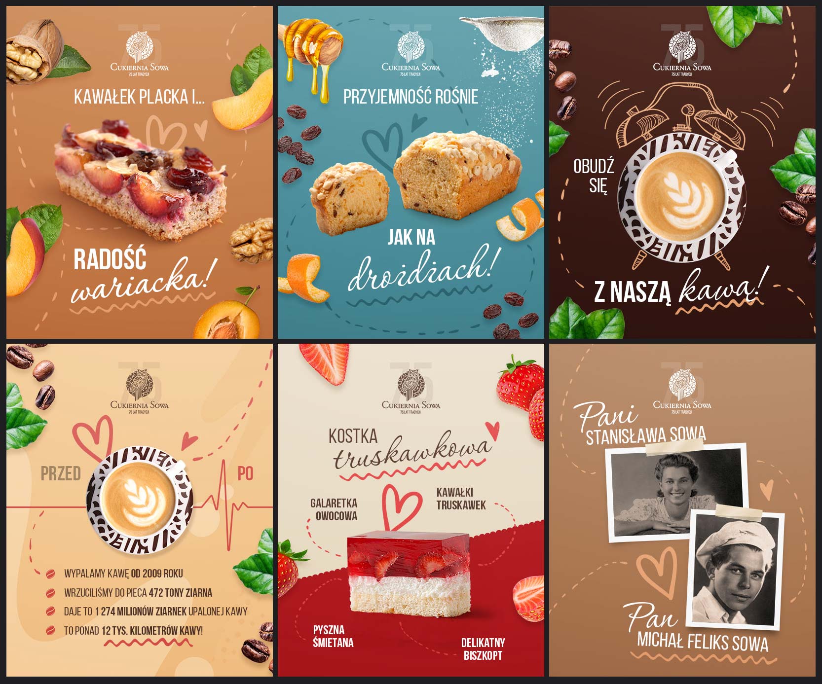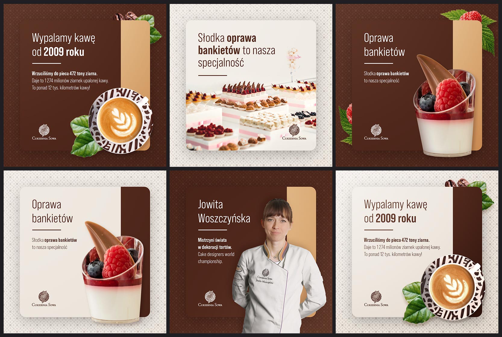 Oprawa graficzna komunikacji w social media dla największej polskiej sieci cukierni – Cukiernia Sowa. Budowa spójnego i rozpoznawalnego wizerunku w kanałach online.