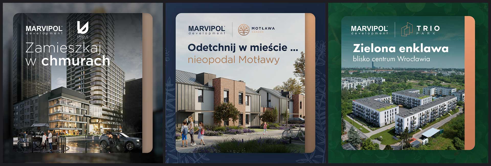 Opracowanie szablonów spójnej komunikacji wizualnej w social media dla Marvipol Development. Projekty podkreślają nowoczesny charakter inwestycji i budują profesjonalny wizerunek marki w kanałach online.